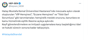 HEP-SEN’in yaptığı açıklamaya göre Hatay Mustafa Kemal Üniversitesi Hastanesi’nde ”VİP HEMŞİRE”  gibi ayrıcalıklı bir görev tanımının açıldığı öne sürüldü.