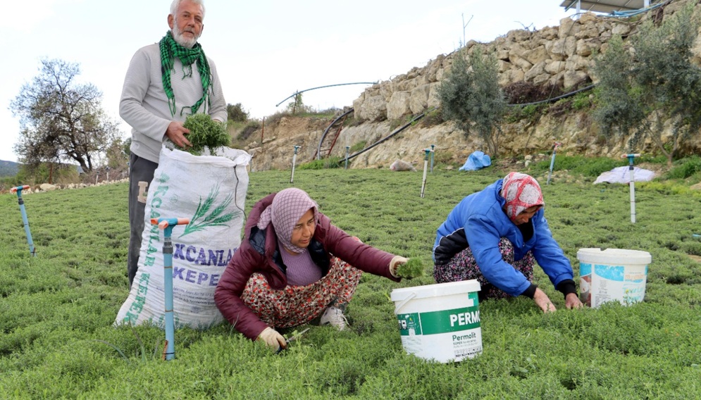 Yeni sezonun ilk mahsulünü tarlasında toplayan çiftçi Mehmet Ali Yılmaz, zahterin üretim sürecine dair bilgi verdi. Yılmaz, ailesi ve günlük yevmiyeli işçilerle birlikte hasat yaptıklarını belirterek, tarlasına yaptığı yatırımlardan bahsetti. Güneş panelleriyle elektrik üreterek sulama sistemini çalıştırdığını söyleyen Yılmaz, zahter hasadının Nisan ayından Ağustos ayına kadar devam ettiğini ifade etti.