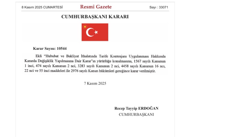8 Kasım 2025 tarihli Resmî Gazete’de yayımlanan karara göre Sıfır gümrükle 1 milyon ton mısır ve 1 milyon ton arpa ithal edilecek. Cumhurbaşkanı Kararı ile Hububat ve Bakliyat İthalatında Tarife Kontenjanı Uygulanması Hakkında Kararda değişiklik yapılarak 1 milyon ton mısır ve 1 milyon ton arpanın sıfır gümrükle ithalatı için tarife kontenjanı açıldı.