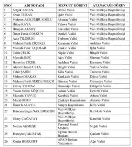 Ayrıca Karaman Valisi Mehmet Fatih Çiçekli Ardahan Valiliği’ne, Çankırı Valisi Mustafa Fırat Taşolar Iğdır Valiliği’ne, Niğde Valisi Cahit Çelik Bingöl Valiliği’ne, Ağrı Valisi Mustafa Koç Giresun Valiliği’ne, Ardahan Valisi Hayrettin Çiçek Karaman Valiliği’ne, Bingöl Valisi Ahmet Hamdi Usta Yalova Valiliği’ne, Kilis Valisi Tamer Şahin Trabzon Valiliği’ne, Kırıkkale Valisi Mehmet Makas Düzce Valiliği’ne, Giresun Valisi Mehmet Fatih Serdengeçti Osmaniye Valiliği’ne, Osmaniye Valisi Erdinç Yılmaz Eskişehir Valiliği’ne, Adana Valisi Yavuz Selim Köşger Denizli Valiliği’ne, Karabük Valisi Mustafa Yavuz Adana Valiliği’ne, Çankaya Kaymakamı Murat Duru Aksaray Valiliği’ne ve Sarıyer Kaymakamı Ömer Kalaylı Kilis Valiliği’ne atandı. Vali-Mülkiye Başmüfettişleri Hüseyin Engin Sarıibrahim Kırıkkale Valiliği’ne ve Oktay Çağatay Karabük Valiliği’ne, İçişleri Bakanlığı Personel Genel Müdürü Nedim Akmeşe Niğde Valiliği’ne, Eğitim Dairesi Başkanı Hüseyin Çakırtaş Çankırı Valiliği’ne ve AFAD Başkan Yardımcısı Önder Bozkurt Ağrı Valiliği’ne atandı.